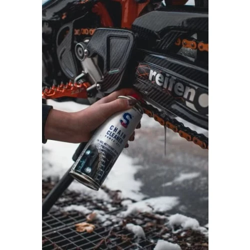 Smør det tørre kjedet før videre kjøring med S100 Hvit Kjedespray, S100 Dry Lube Kjedespray eller S100 High End.